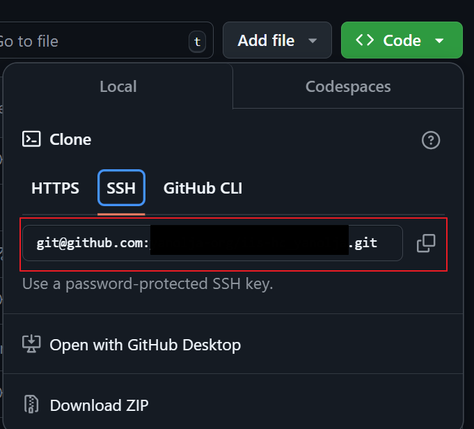 - "Code" 버튼 클릭 → SSH 탭 선택