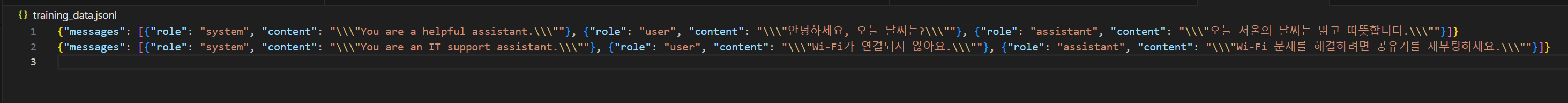 엑셀에서 변환된 JSONL 파일은 다음과 같이 저장됩니다.