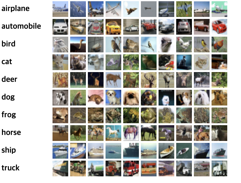 - 10/100개의 클래스, 32x32 RGB 이미지