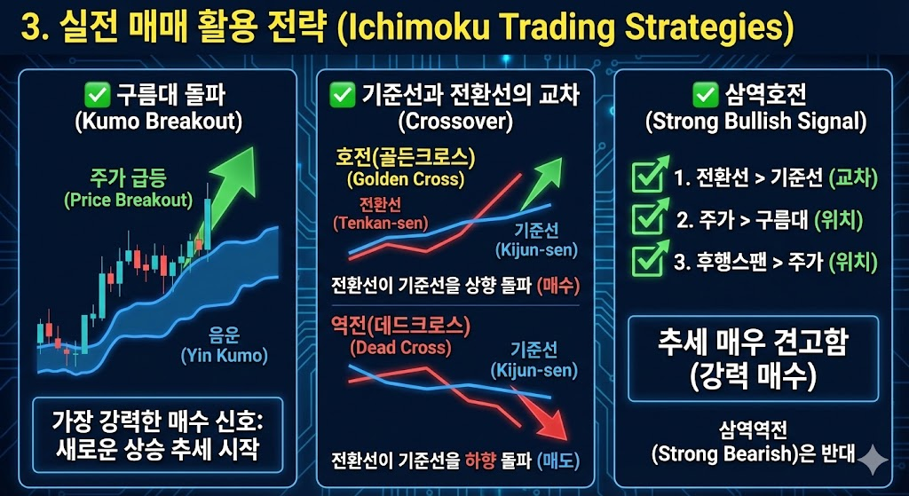주가가 두꺼운 음운(하락 구름)을 뚫고 위로 올라오면 새로운 상승 추세의 시작으로 봅니다. 이를 **'구름대 돌파'**라고 하며, 매우 신뢰도가 높은 매수 신호입니다.
