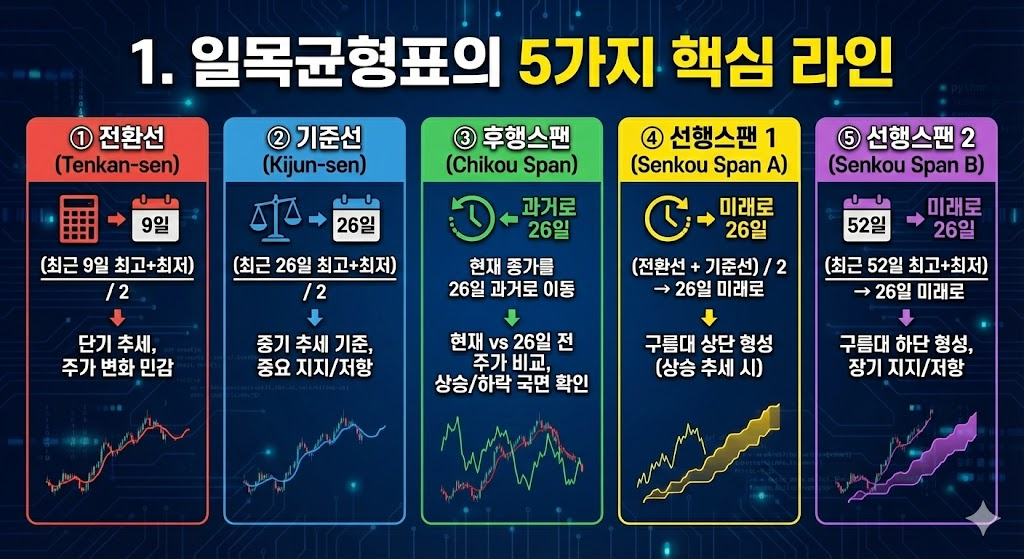 1930년대 일본의 신문기자였던 호소다 고이치(필명 일목산인)가 7년의 연구 끝에 개발한 이 지표는 서양의 지표들이 주로 '가격'에 집중할 때, '시간'의 개념을 도입한 획기적인 도구입니다. 오늘은 일목균형표의 핵심인 5가지 선과 구름대를 정복해 보겠습니다.