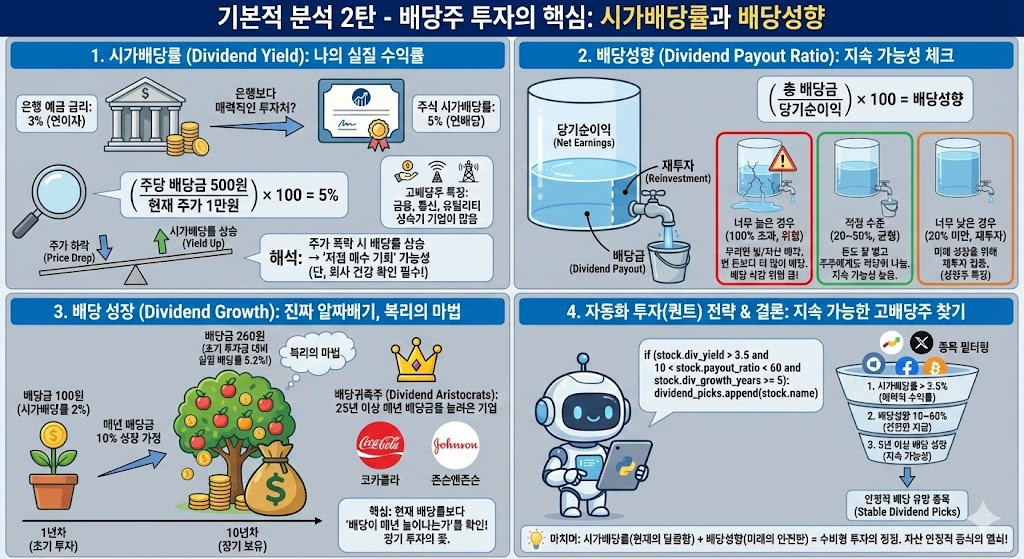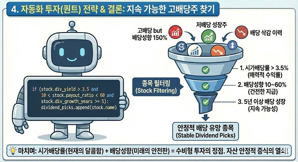 단순히 배당률이 높은 순서로 정렬하는 것이 아니라, 배당성향이 건전한지를 반드시 체크하는 코드를 넣는 것이 자동화 투자의 실패를 줄이는 비결입니다.