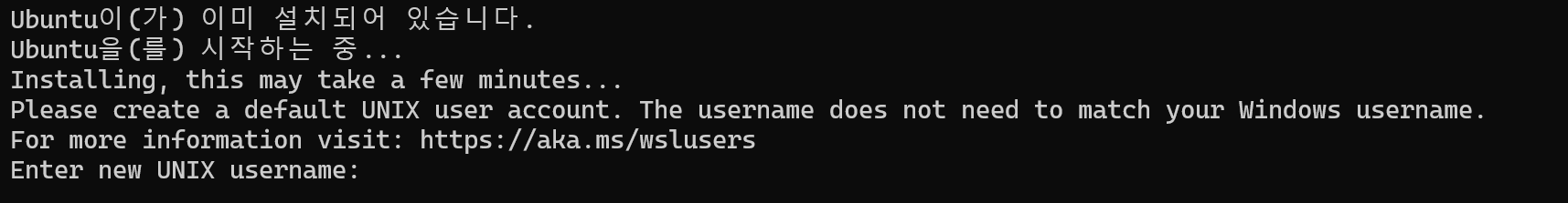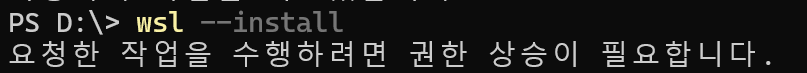 ▲위와 같은 화면을 보았다면, 관리자 권한으로 실행하지 않은 것입니다. - 다음 명령어를 입력하여 WSL을 활성화합니다:이 명령어는 WSL과 기본 리눅스 배포판(우분투)을 자동으로 설치합니다.