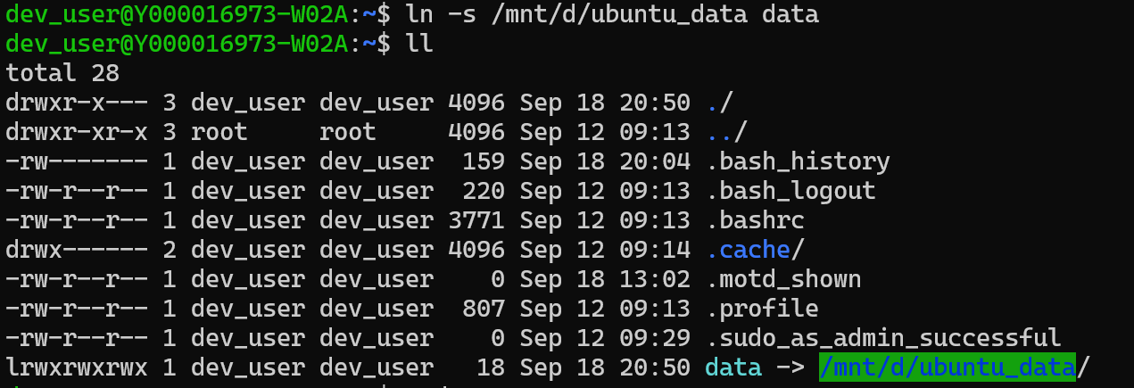 이번 블로그 글에서는 WSL에서 생성한 심볼릭 링크에 파일을 생성하고, Windows 탐색기를 통해 해당 파일을 확인하는 방법을 자세히 설명하겠습니다. 이전에 설명한 대로 WSL에서 D 드라이브의 ubuntu_data 폴더에 대한 심볼릭 링크를 생성한 후, 이 링크를 통해 파일을 생성하고 Windows에서 확인해보겠습니다.