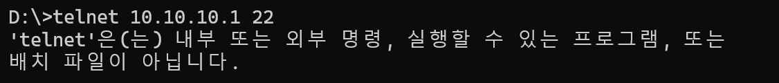 - 아래와 같이 메시지가 나오면 telnet 명령어가 활성화가 되어 있지 않은 상태입니다.
