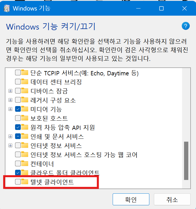 3. Windows 기능 팝업에서 텔넷 클라이언트 활성화