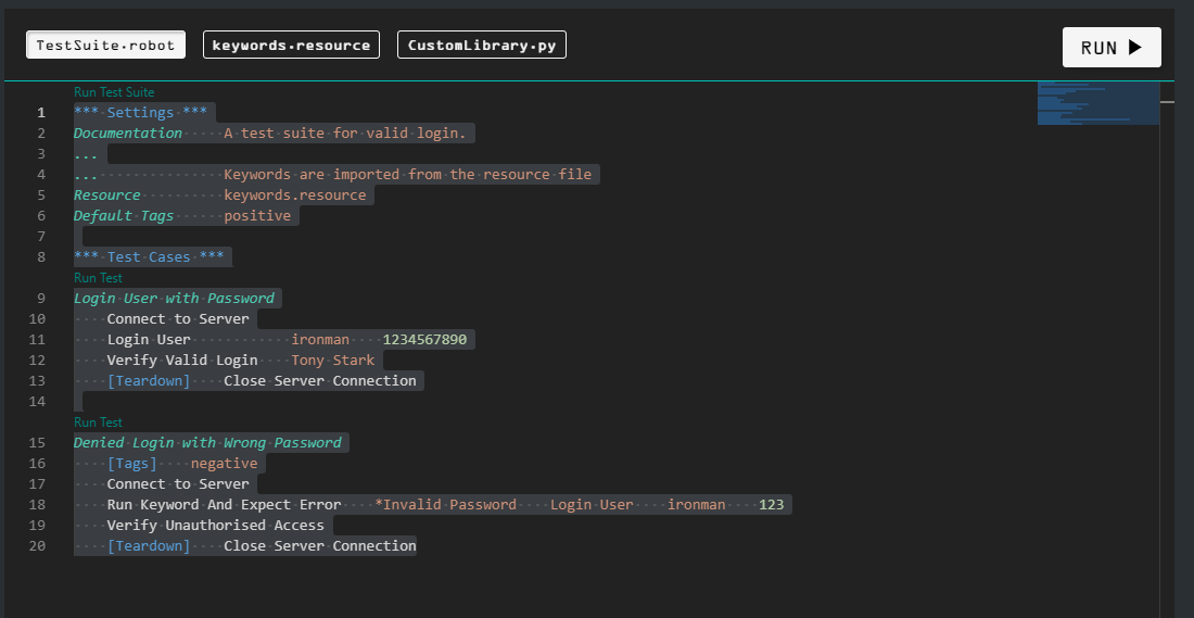 로봇 프레임워크는 사용자 정의 키워드를 활용하여 테스트를 구조화하고, 쉽게 이해할 수 있는 방식으로 작성할 수 있도록 돕습니다. 위의 예제에서는 유효한 로그인과 잘못된 비밀번호로 인한 로그인 실패를 검증하는 두 가지 테스트 케이스를 보여주었습니다.
