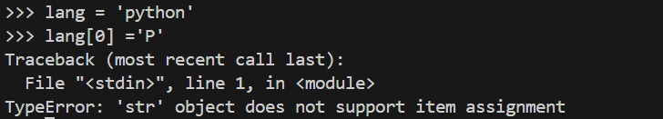 - TypeError 발생: 파이썬은 문자열의 내용을 수정하려는 시도가 있을 때 TypeError를 발생시킵니다. 이 오류 메시지는 "string object does not support item assignment" (문자열 객체는 항목 할당을 지원하지 않음)이라는 내용을 포함합니다. 이는 문자열이 불변이기 때문에 발생하는 오류입니다.