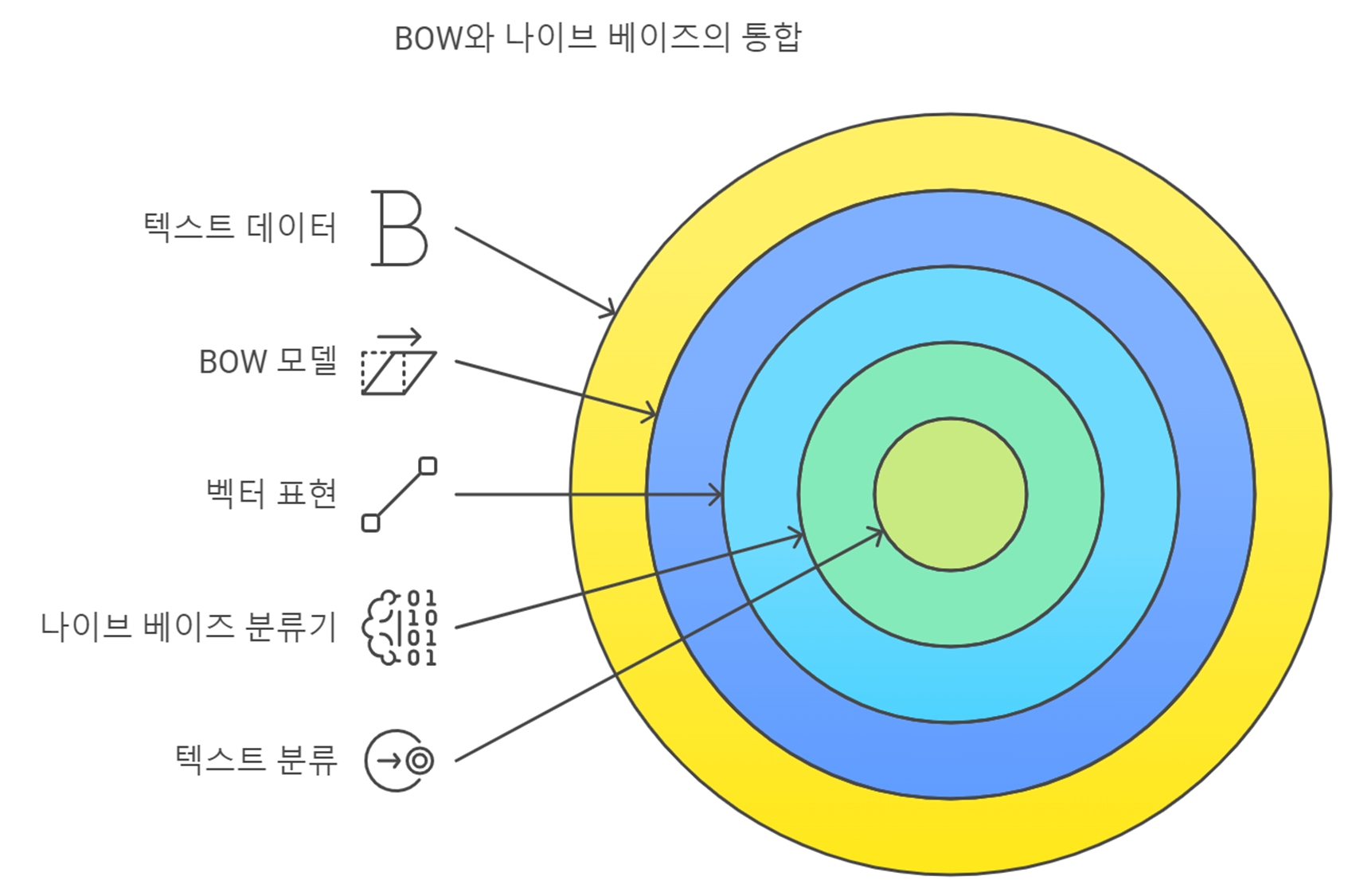 BoW 모델로 변환된 텍스트 데이터를 나이브 베이즈 분류기에 입력하면, 각 단어의 출현 빈도에 기반하여 문서의 클래스를 예측할 수 있습니다. 이 조합은 텍스트 분류 작업에서 매우 효과적입니다.