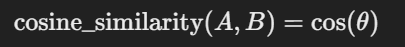 코사인 유사도는 두 벡터 간의 각도를 기반으로 유사성을 측정합니다. 두 벡터 AA와 BB에 대해 코사인 유사도는 다음과 같이 정의됩니다:
